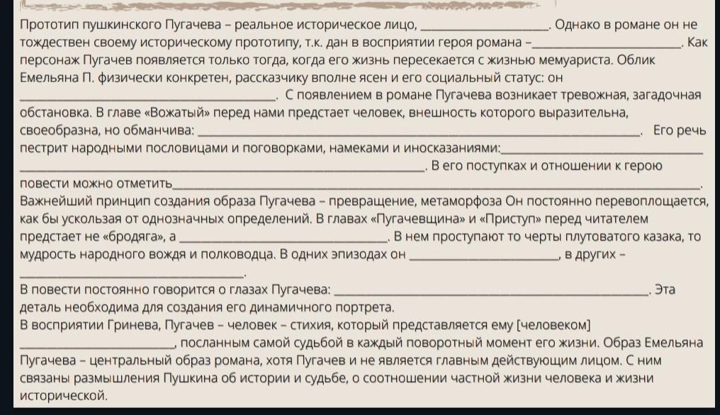 Вставте недостающие фразы (2 балла) Прототип пушкинского Пугачева - реальное историческое лицо, тождествен своему историческому прототипу, т.к. дан в восприятии героя романа персонаж Пугачев появляется только тогда, когда его жизнь пересекается с жизнью мемуариста. Облик Емельяна П. физически конкретен, рассказчику вполне ясен и его социальный статус он С появлением в романе Пугачева возникает тревожная, загадочная обстановка. В главе «Вожатый» перед нами предстает человек, внешность которого выразительна, своеобразна, но обманчива: Его речь пестрит народными пословицами и поговорками, намеками и иносказаниями: Однако в романе он не Kak мудрость народного вождя и полководца. В одних эпизодах он В его поступках и отношении к герою повести можно отметить Важнейший принцип создания обра Пугачева-превращение, метаморфоза Он постоянно перевоплощается, как бы ускользая от однозначных определений. В главах «Пугачевщина» и «Приступ» перед читателем предстает не бродяга», а В нем проступают то черты плутоватого казака, то в других - Эта В повести постоянно говорится о глазах Пугачева: деталь необходима для создания его динамичного портрета. В восприятии Гринева, Пугачев-человек-стихия, который представляется ему [человеком] посланным самой судьбой в каждый поворотный момент его жизни. Образ Емельяна Пугачева-центральный образ романа, хотя Пугачев и не является главным действующим лицом. С ним связаны размышления Пушкина об истории и судьбе, о соотношении частной жизни человека и жизни исторической.