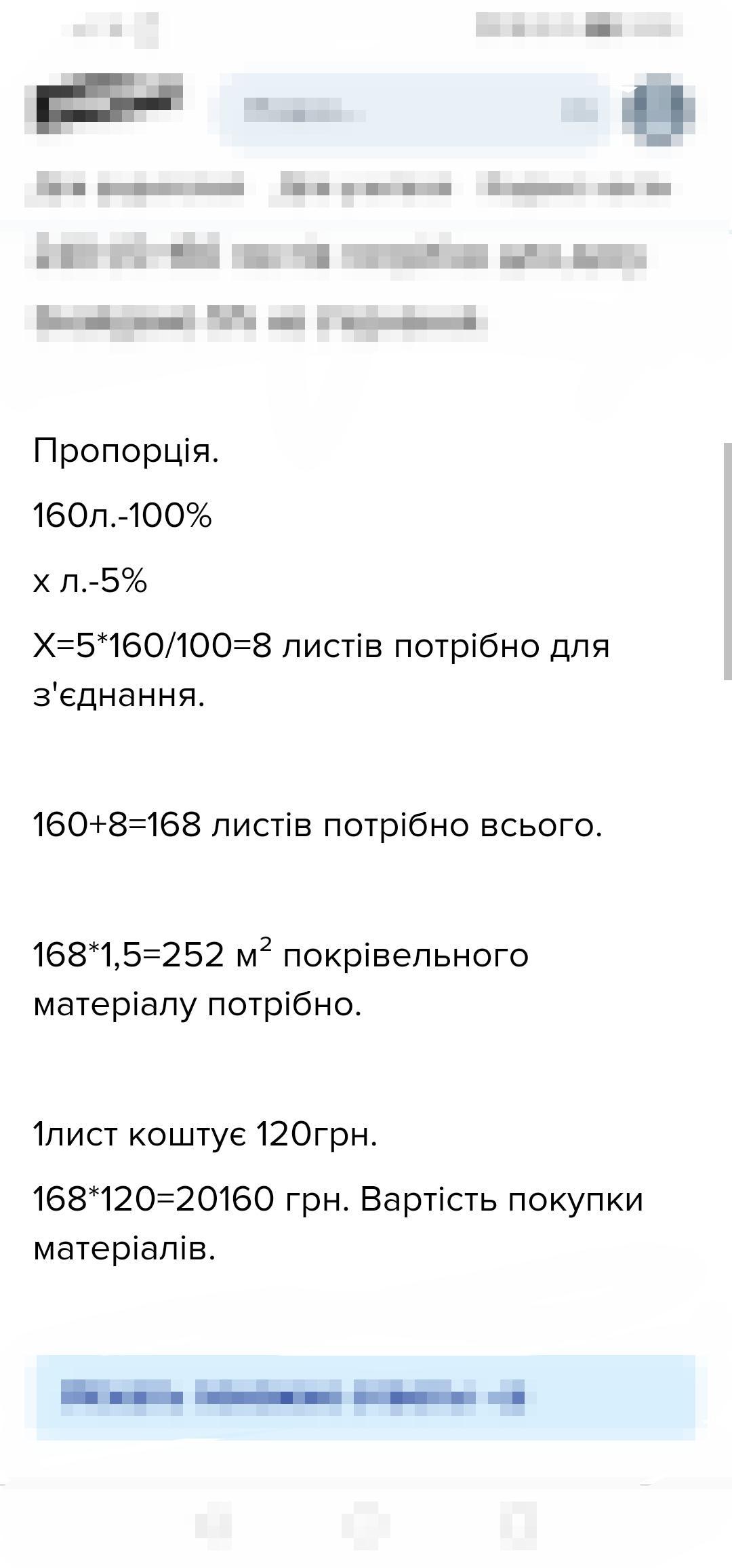 Дах будинку має форму правильної чотирикутної піраміди, сторона основи якої 10м, а бічне ребро 13м. Дах потрібно покрити бляхою, розмір аркуша якої 1х1,5 м, а ціна - 120 грн. за аркуш. Скільки квадратних метрів покрівельного матеріалу потрібно і яка буде вартість покупки, якщо на зʼєднання відпаде 5%?