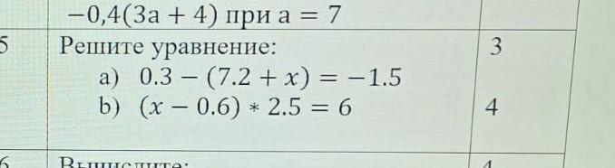 5 -0,4(3а + 4) при а = 7 Решите уравнение: a) 0.3 - (7.2 + x) = -1.5 b) (x - 0.6) * 2.5 = 6 3 4