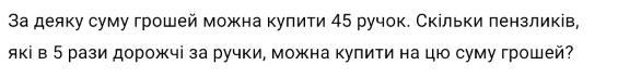 Если "пензик" стоит в 5 раз дороже. То 1 стоит 5 ручек. Это значит что за ту же сумму можно купить в 5 раз меньше "пензиков" чем ручек. 45/5=9