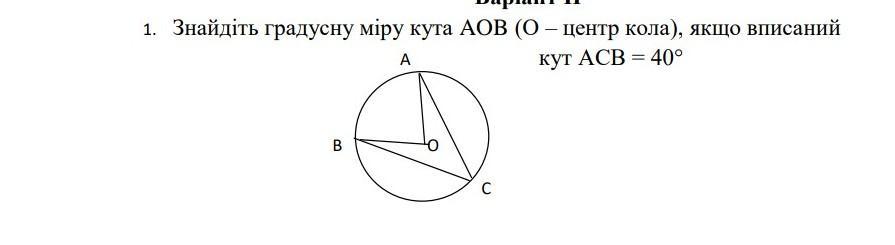 1. Знайдіть градусну міру кута АОВ (О A в центр кола), якщо вписаний кут АСВ=40°