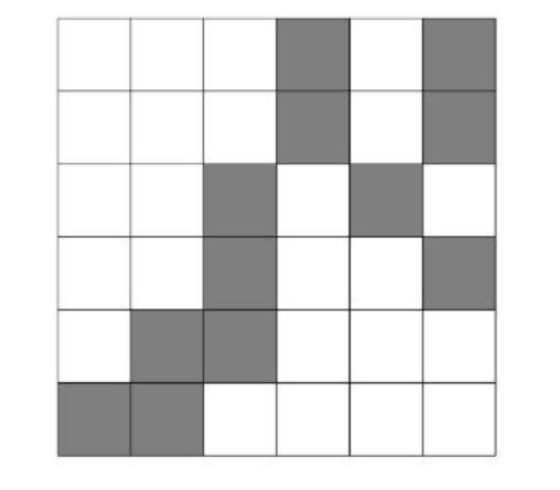 Розріже квадрат 6 х 6 на 4 однакових частини так, щоб у кожній з них було рівно 3 зафарбовані клітинки