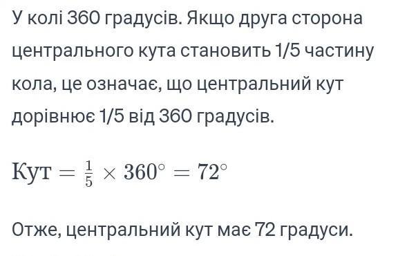 скільки градусів має центральний кут якщо відповідна йому друга сторона становить 1/5 частину кола?