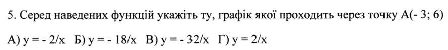Щоб дізнатися, яка функція проходить через точку А (-3:6), треба підставити цю точку в функцію. В цьому випадку точку А треба підставити в функцію варіанту Б y = -18/x, тобто 6 = -18/-3; 6 = 6.