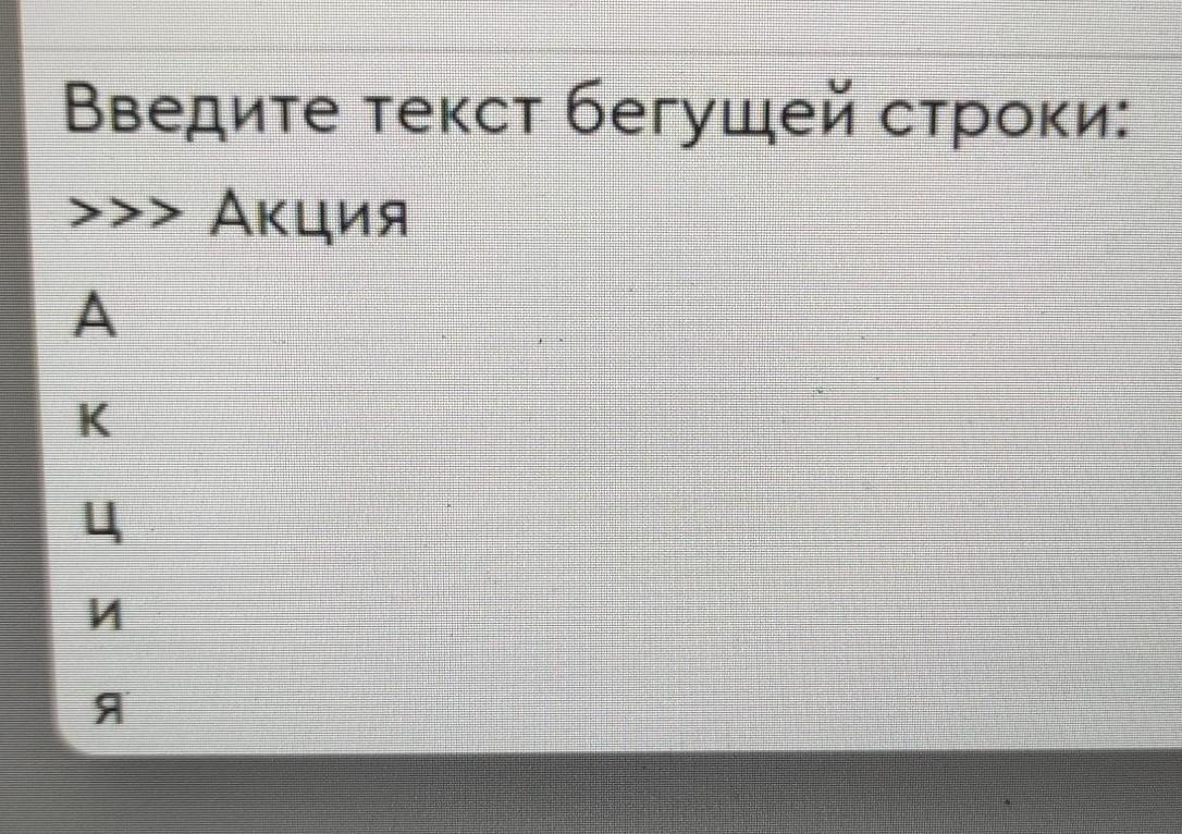 Для установки новой бегущей строки на вывеске магазина «Долголетие» требуется написать программу, которая разделяет любой введённый текст на отдельные символы. Программа должна считать текст бегущей строки. Затем программа должна вывести полученный текст по одному символу на каждой строке. Программа должна работать как на картинке.