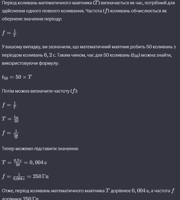 Скільки часу коливається математичний маятник, який здійснює 50 коливань з періодом коливань 0,2 с. Яка його частота коливань?