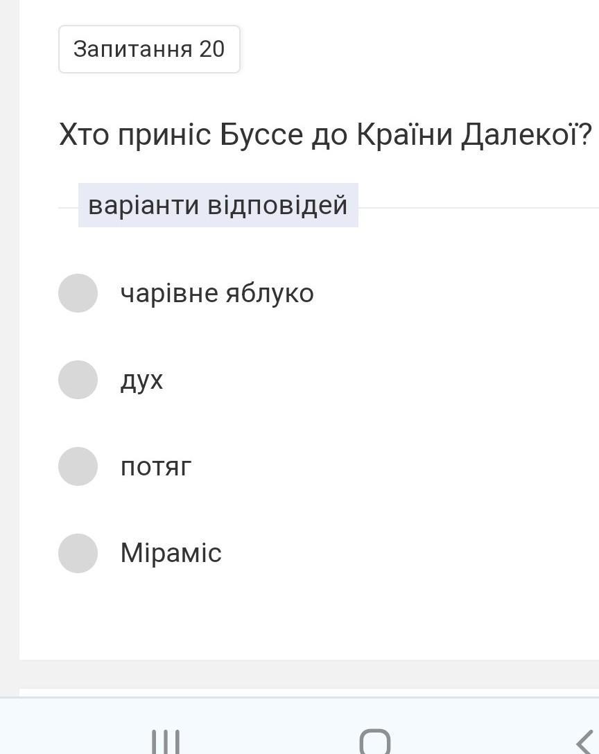 Запитання 20 Хто приніс Буссе до Країни Далекої? варіанти відповідей чарівне яблуко ДУХ ПОТЯГ Міраміс срочно даю 100 балов