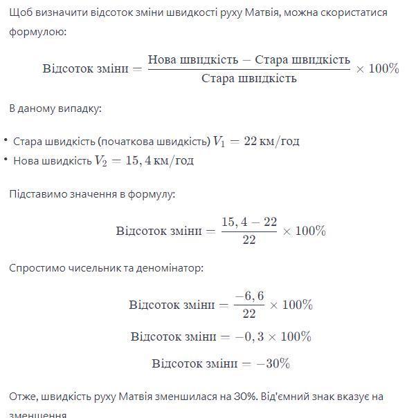 Матвій їхав 22 км/год потім він сповільнився до 15,4 км/год наскільки відсотків змінилася швидкість руху матвія