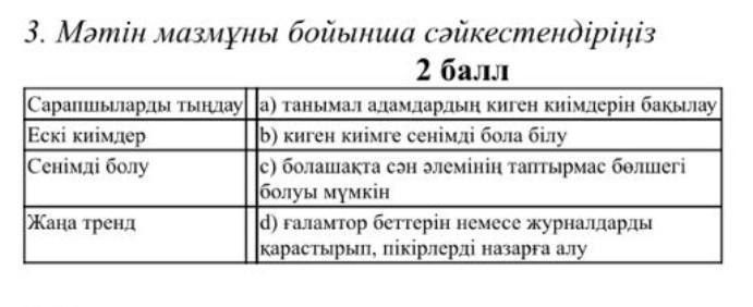 3. Мәтін мазмұны бойынша сәйкестендіріңіз Сарапшыларды тындауа танымал адамдардын киген киiмдерiн бакылау Ескi киiмдер [b) киген киiмге сенiмдi бола білу Сенiмдi болу c) болашақта сән әлемiнiн таптырмас бөлшегі болуы мумкiн жана тренд d) ғаламтор беттерiн немесе журналдарды карастырып, пікірлерді назарға алу