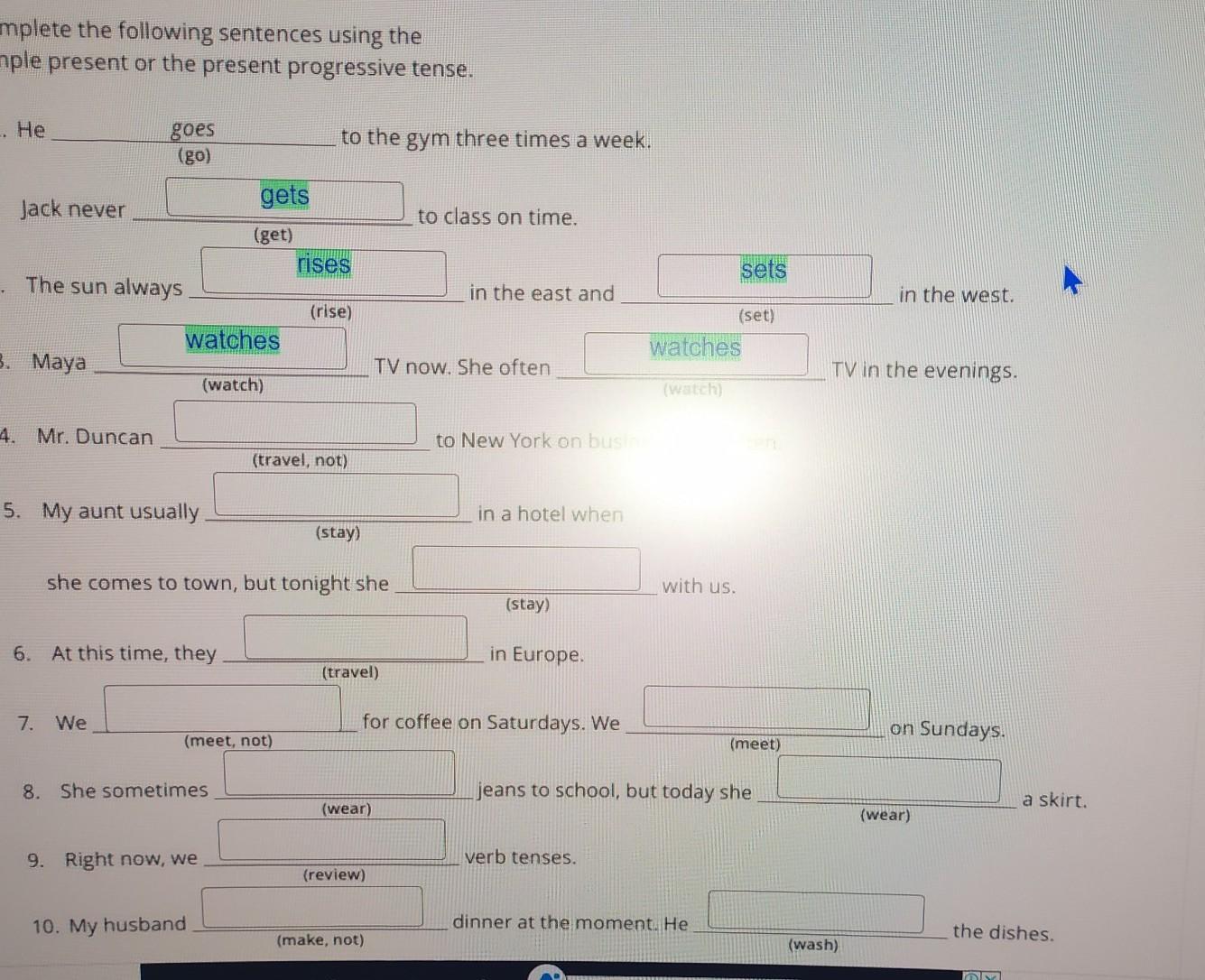 Complete the following sentences using the simple present or the present progressive tense. Ex. Hel 1. Jack never 2. The sun always 3. Maya 4. Mr. Duncan goes (go) 5. My aunt usually 7. We THER PUMP watches modtang zakarillad f 6. At this time, they 10. My husband gets (get) 8. She sometimes 9. Right now, we (watch) (meet, not) to the gym three times a week. she comes to town, but tonight she TCAICOS rises maline (rise) (travel, not) (stay) (travel) (wear) (review) (make, not) to class on time. in the east and TV now. She often in a hotel when (stay) for coffee on Saturdays. We to New York on business very often. in Europe. TUDY TEK sets verb tenses. (set) watches Bank with and (watch) with us. dinner at the moment. He jeans to school, but today she (meet) in the west. TV in the evenings. (wash) on Sundays. (wear) a skirt. the dishes.