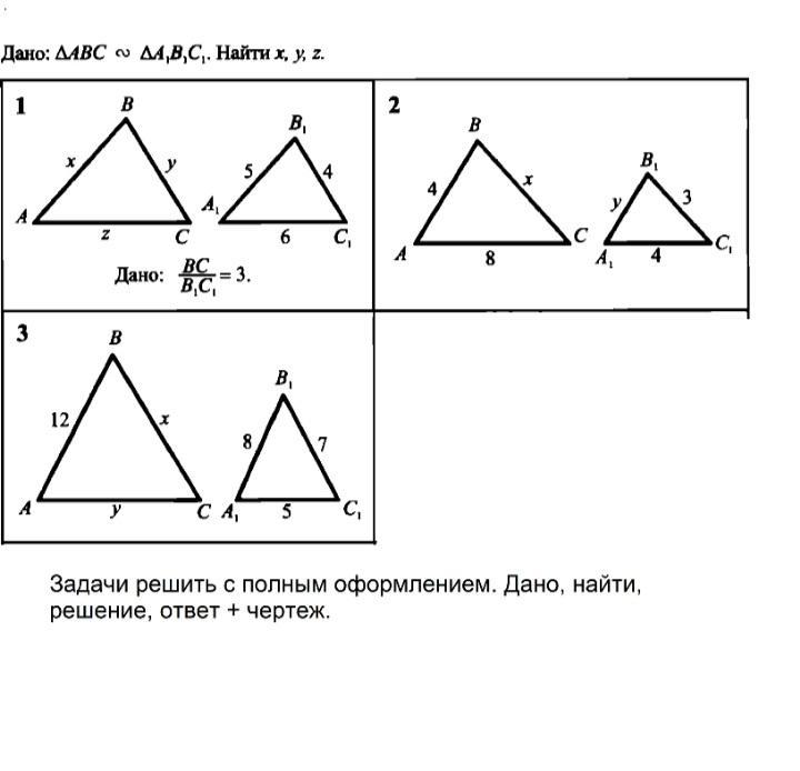 В первом - x=15,y=12,z=18 второй - x=6,y=2 третий - x=10.5, y=7.5