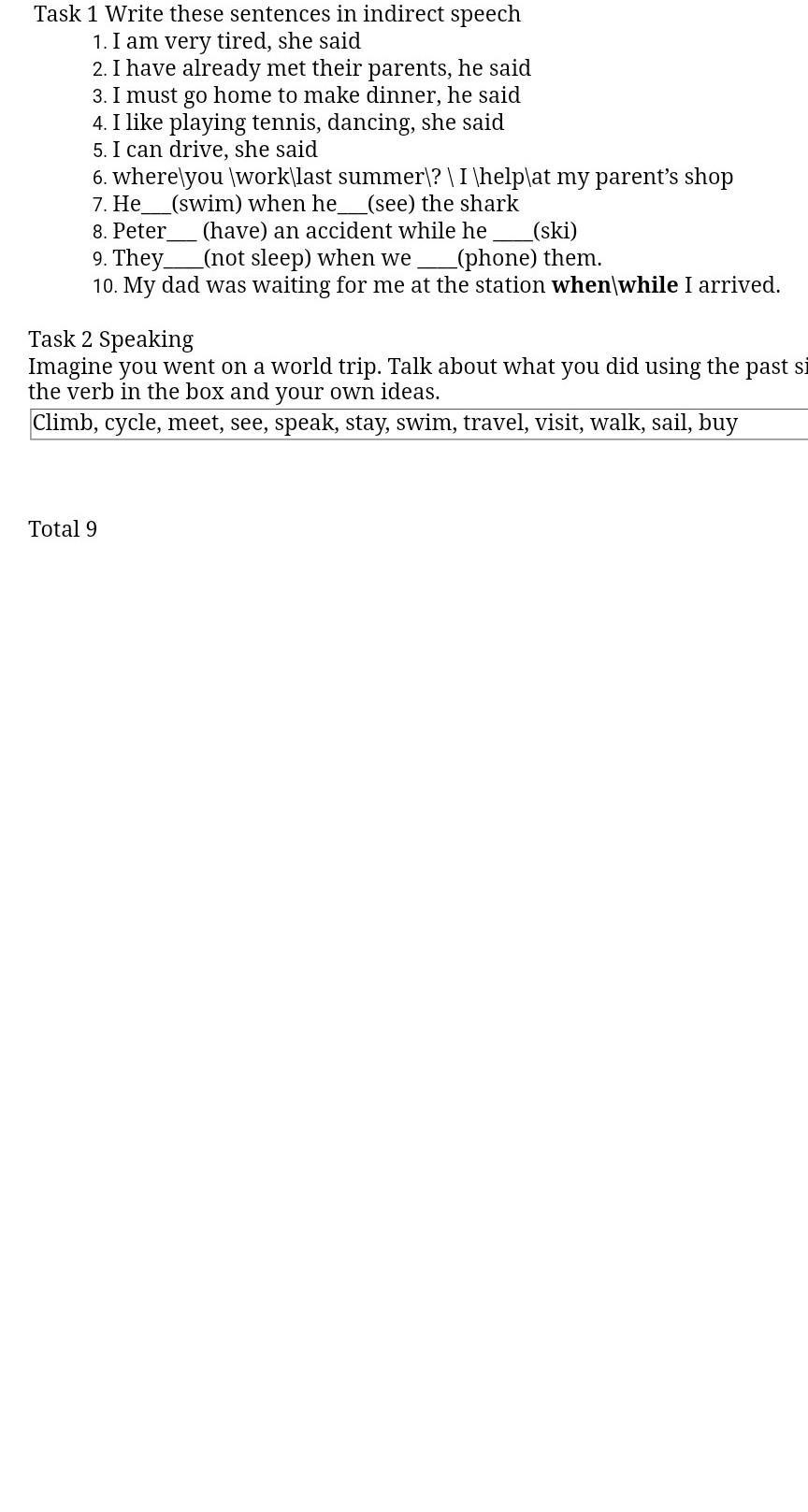 СРОЧНО ДАЮ 60 БАЛОВ Task 1 Write these sentences in indirect speech 1. I am very tired, she said 2. I have already met their parents, he said 3. I must go home to make dinner, he said 4. I like playing tennis, dancing, she said 5. I can drive, she said 6. where you work\last summer\? \ I \help\at my parent's shop 7. He__(swim) when he (see) the shark 8. Peter (have) an accident while he (ski) _(phone) them. 9. They _(not sleep) when we 10. My dad was waiting for me at the station when\while I arrived.