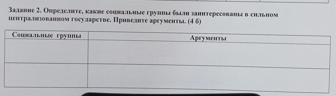 Задание 2. Определите, какие социальные группы были заинтересованы в сильном централизованном государстве. Приведите аргументы. (4 б) Социальные группы Аргументы