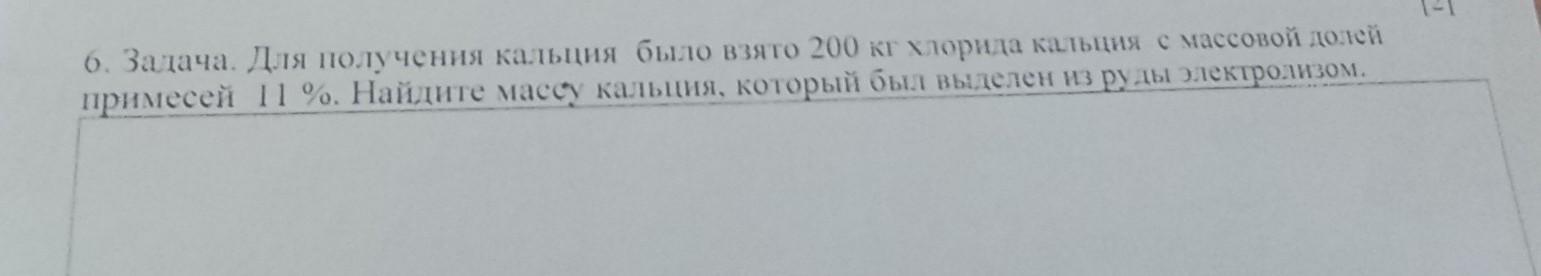 6. Задача. Для получения кальция было взято 200 кг хлорида кальция с массовой долей примесей 11%. Найдите массу кальция, который был выделен из руды электролизом.