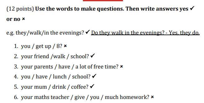 e.g. they/walk/in the evenings? ✓ Do they walk in the evenings? - Yes, they do.