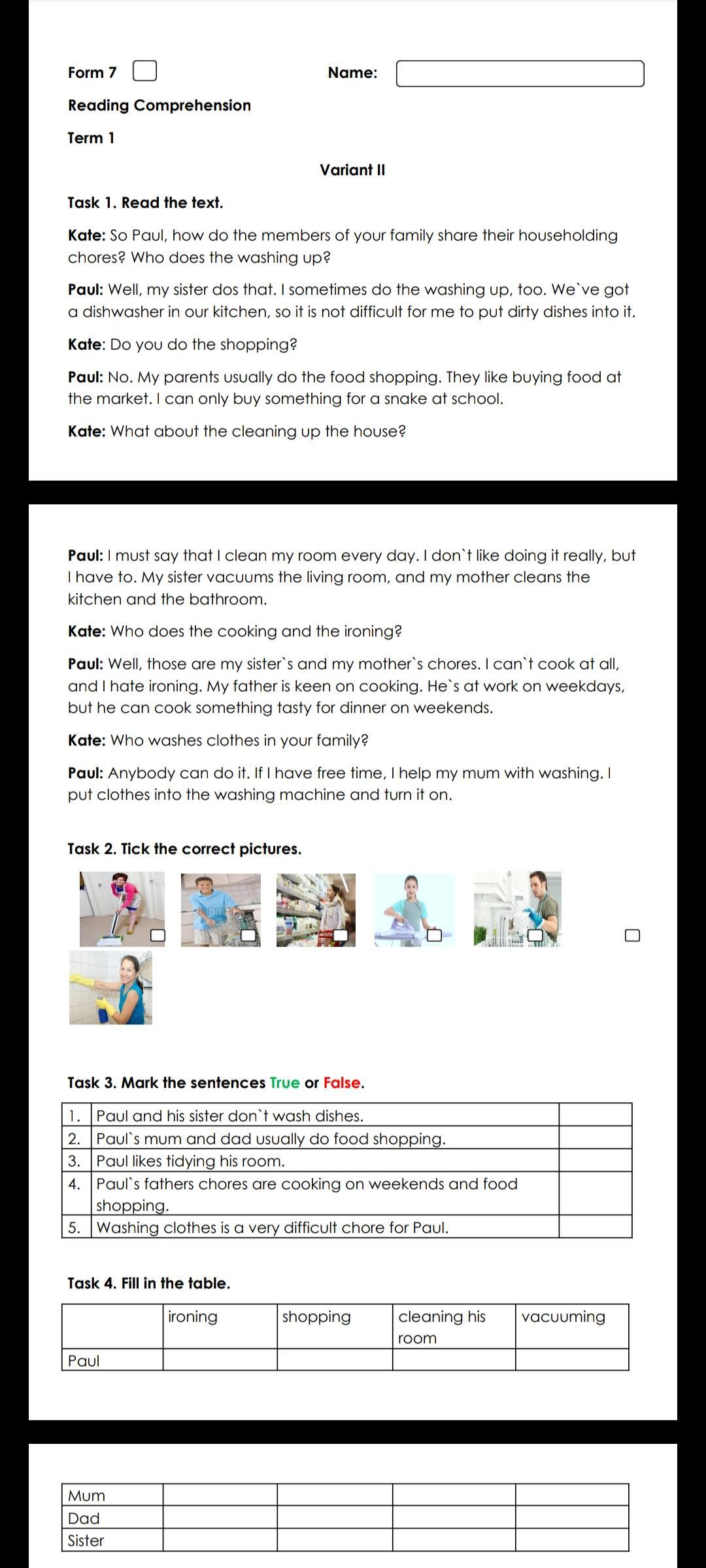 False - Paul and his sister do wash dishes.True - Paul's mum and dad usually do food shopping.False - Paul doesn't like tidying his room; he has to do it.False - Paul's father's chores are cooking on weekends, not food shopping.False - Washing clothes is not a very difficult chore for Paul