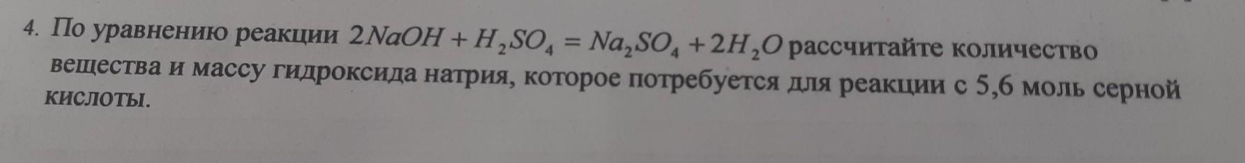 4. По уравнению реакции 2NaOH + H²SO⁴ = Na2SO4 + 2H2O рассчитайте количество вещества и массу гидроксида натрия, которое потребуется для реакции с 5,6 моль серной кислоты.