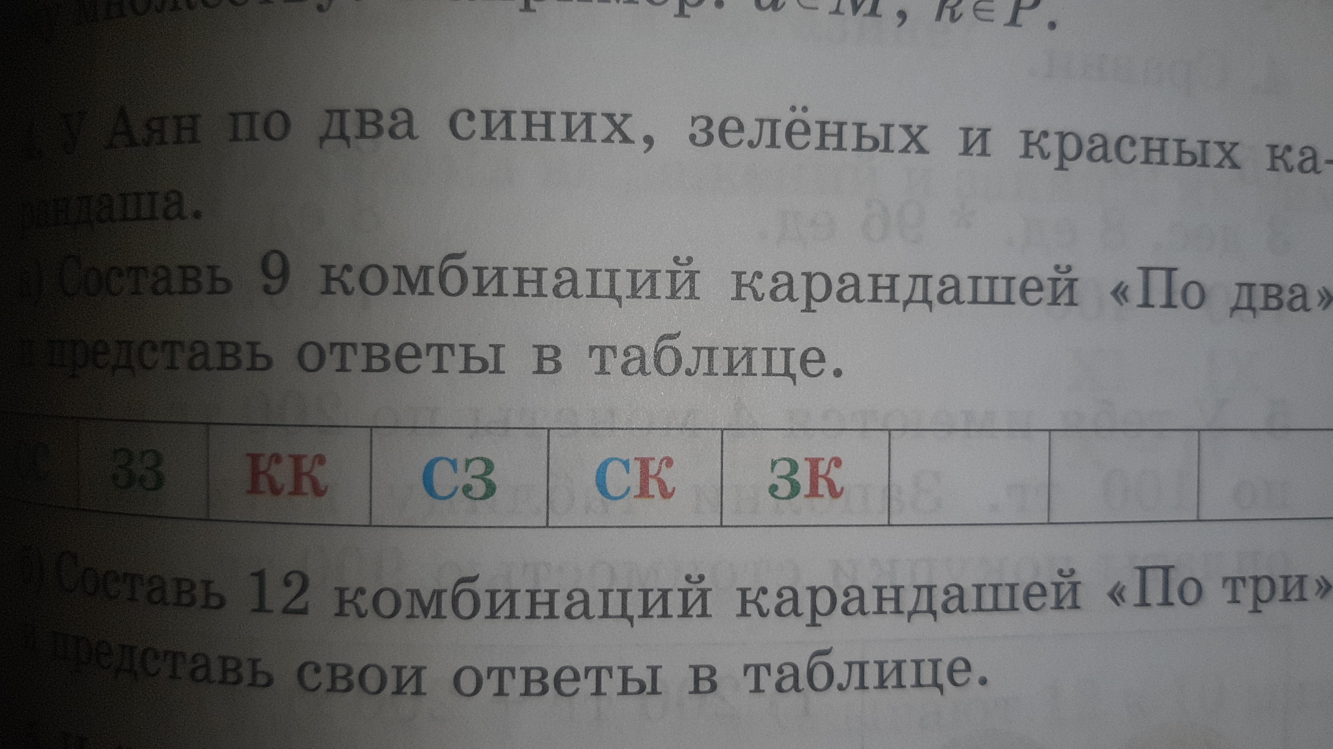 У Аян по два синих, зелёных и красных карандаша. а) Составь 9 комбинаций карандашей "по два" и представь ответы в таблице . б) составь 12 комбинаций карандашей "по три" и представь свои ответы в таблице.
