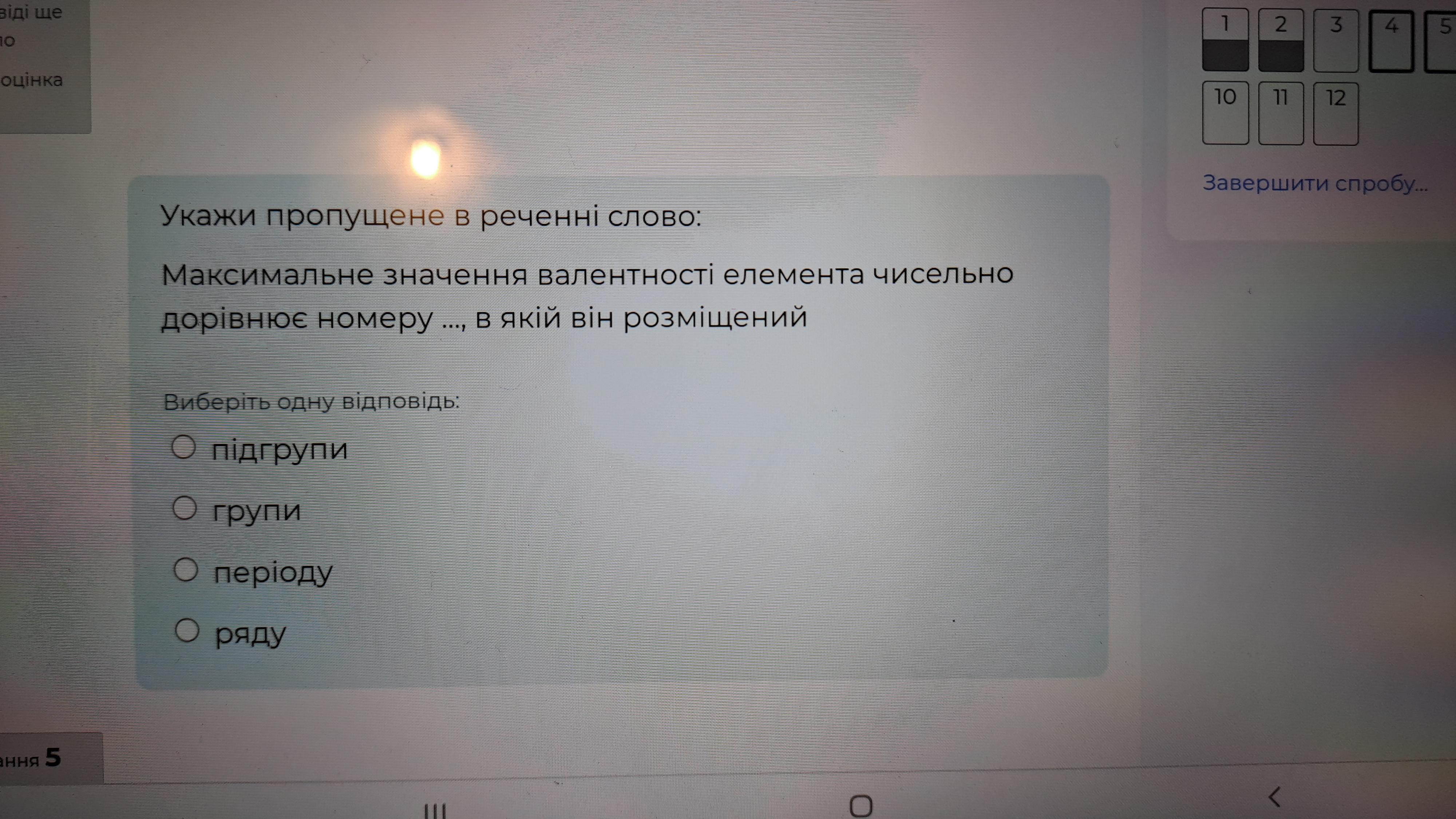 Укажи пропущені в реченні слово: Максимальне значення валентності елемента численно дорівнює номеру .....,в якій він розміщений.