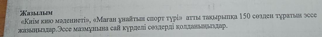 Жазылым -Киім кию мәдениеті», «Маған ұнайтын спорт түрі» атты тақырыпқа 150 сөзден тұратын эссе -азыныздар. Эссе мазмұнына сай күрделі сөздерді қолданыңыздар.