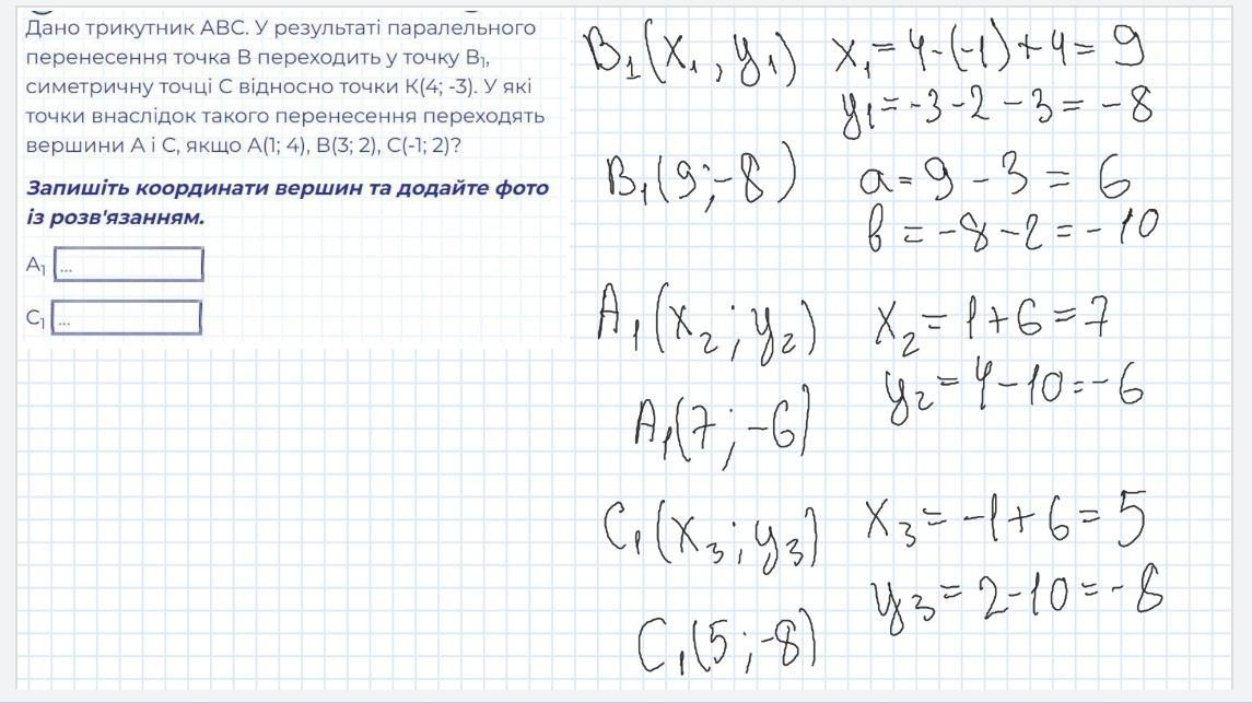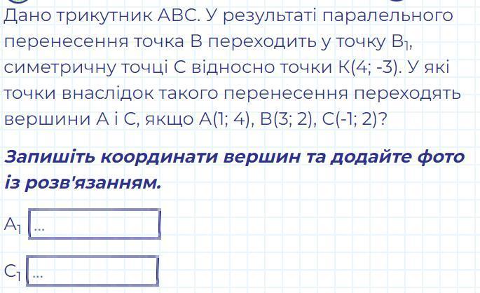 Дано трикутник АВС. У результаті паралельного перенесення точка В переходить у точку В1, симетричну точці С відносно точки К(4; -3). У які точки внаслідок такого перенесення переходять вершини А і С, якщо А(1; 4), В(3; 2), С(-1; 2)?.