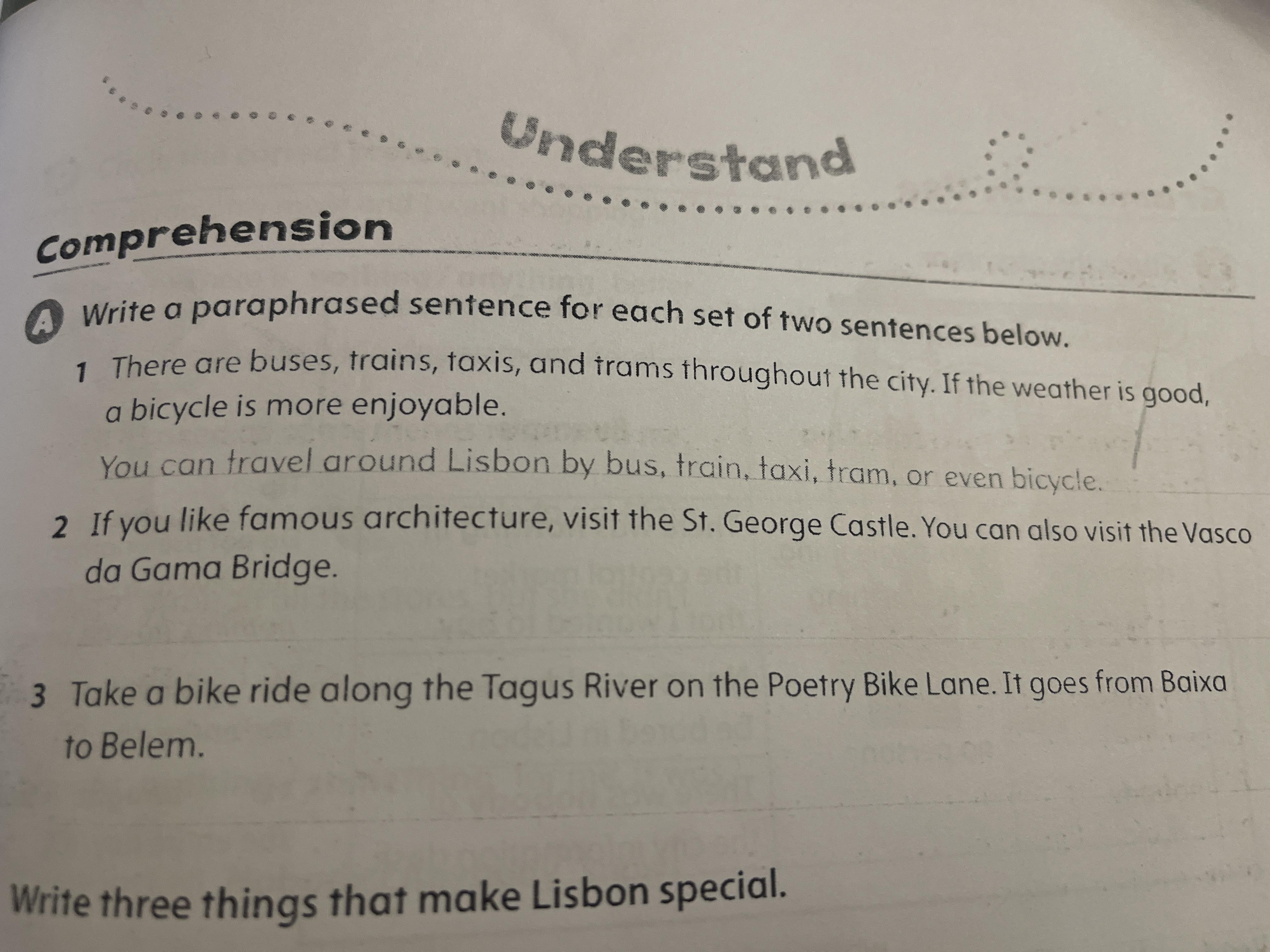 Write a paraphrased sentence for each set of two sentences below. 1 There are buses, trains, taxis, and trams throughout the city. If the weather is gor a bicycle is more enjoyable. You can travel around Lisbon by bus, train, taxi, tram, or even bicycle. 2 If you like famous architecture, visit the St. George Castle. You can also visit the da Gama Bridge. 3 Take a bike ride along the Tagus River on the Poetry Bike Lane. It goes from B to Belem.