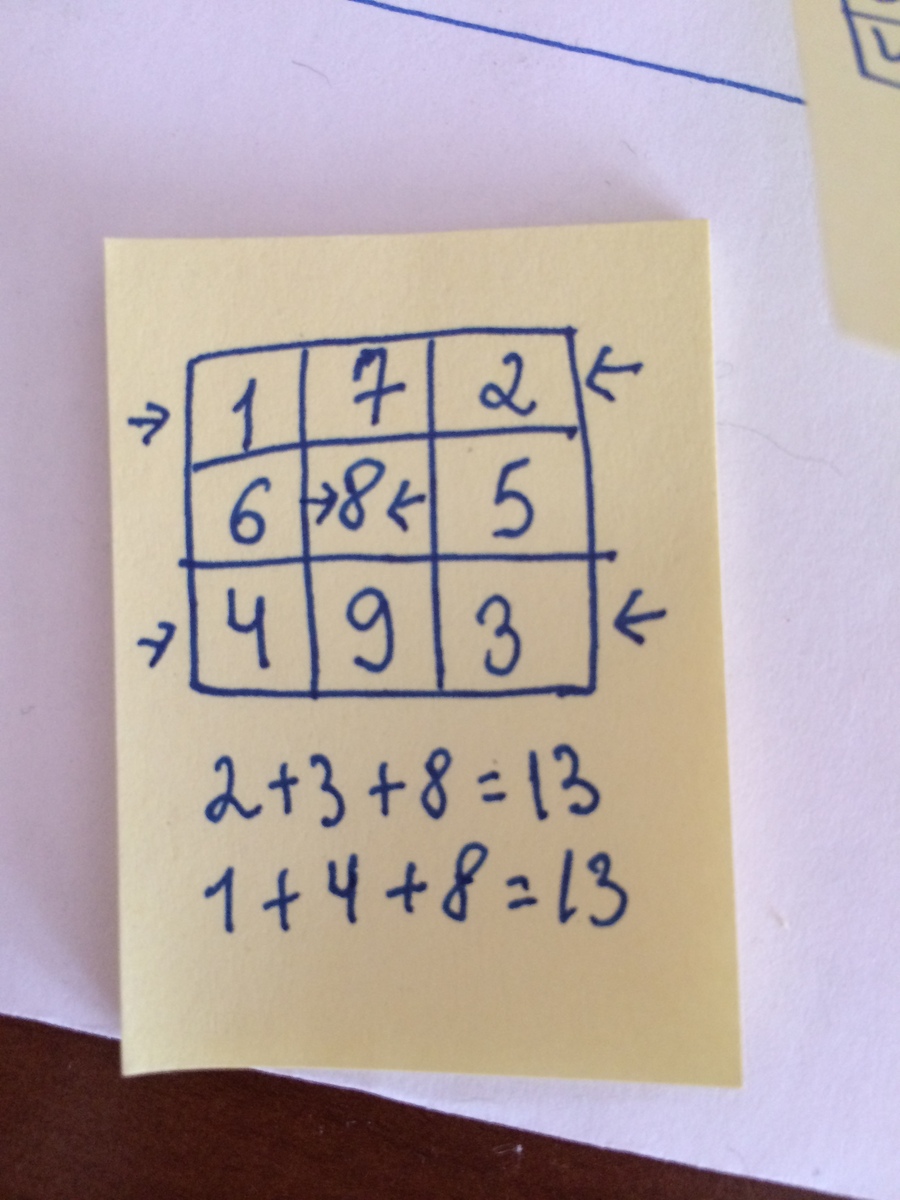 ник вписал числа 1,2,3,4,5,6,7,8,9 в клетки таблицы 3*3. четыре из этих чисел уже стоят: в верхнем левом углу цифра 1, в верхнем правом углу - 2, в нижнем правом - 3, нижнем левом - 4. ник заметил, что число 5 вписано в такую клетку, что сумма чисел в клетках, имеющих с ней общую сторону, равна 13. кроме того, таким же свойством обладает клетка с числом 6. какое число вписано в центральную клетку.( варианты ответов: 5, 6, 7, 8, 9)