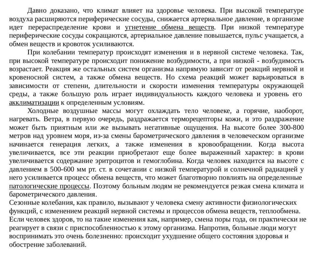Климат, как и другие явления влияют на здоровье человека, и не только, когда температура воздуха высокая, то тогда человеку становится хуже, поднимается давление, а если холодно, то уже не оборот давление становится меньше. Каждый нормальный человек не будет выходить а мороз в майке и шортах, а в жару в зимней куртке, но климат действует ещё на ум человекека, ну и на сому температуру. Когда на улице жарко, человек может получить солнечный удар, а не бойся упасть в обморок. Но все же все предупреждают людей, что надо одеваться по теплее, или более раскрыто.