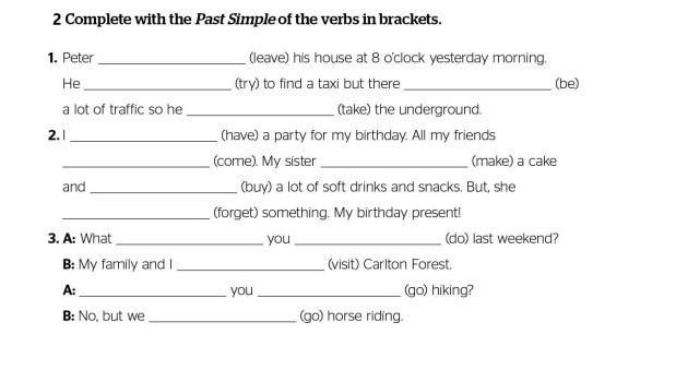 1. left; tried; is; took. 2. had; came; made; bought; forgot, 3. A: did you do, B: visited, A: did you go, B: went.
