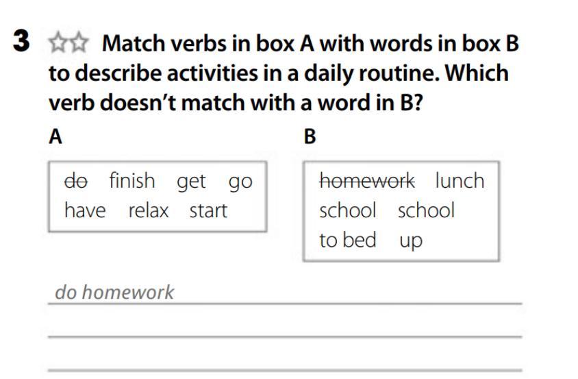 do homework, finish school, get up, go to bed, have lunch, start school. relax лишнее