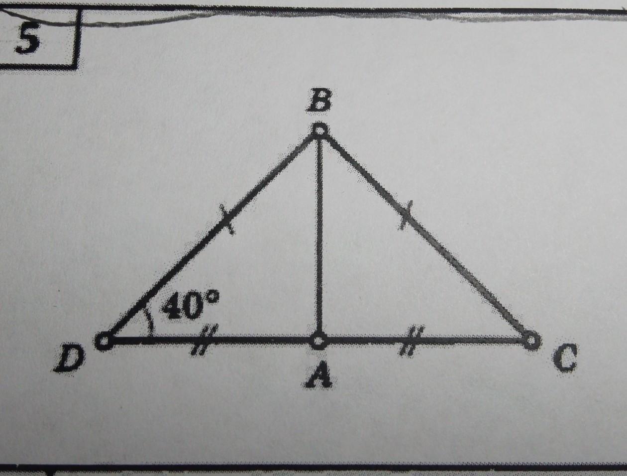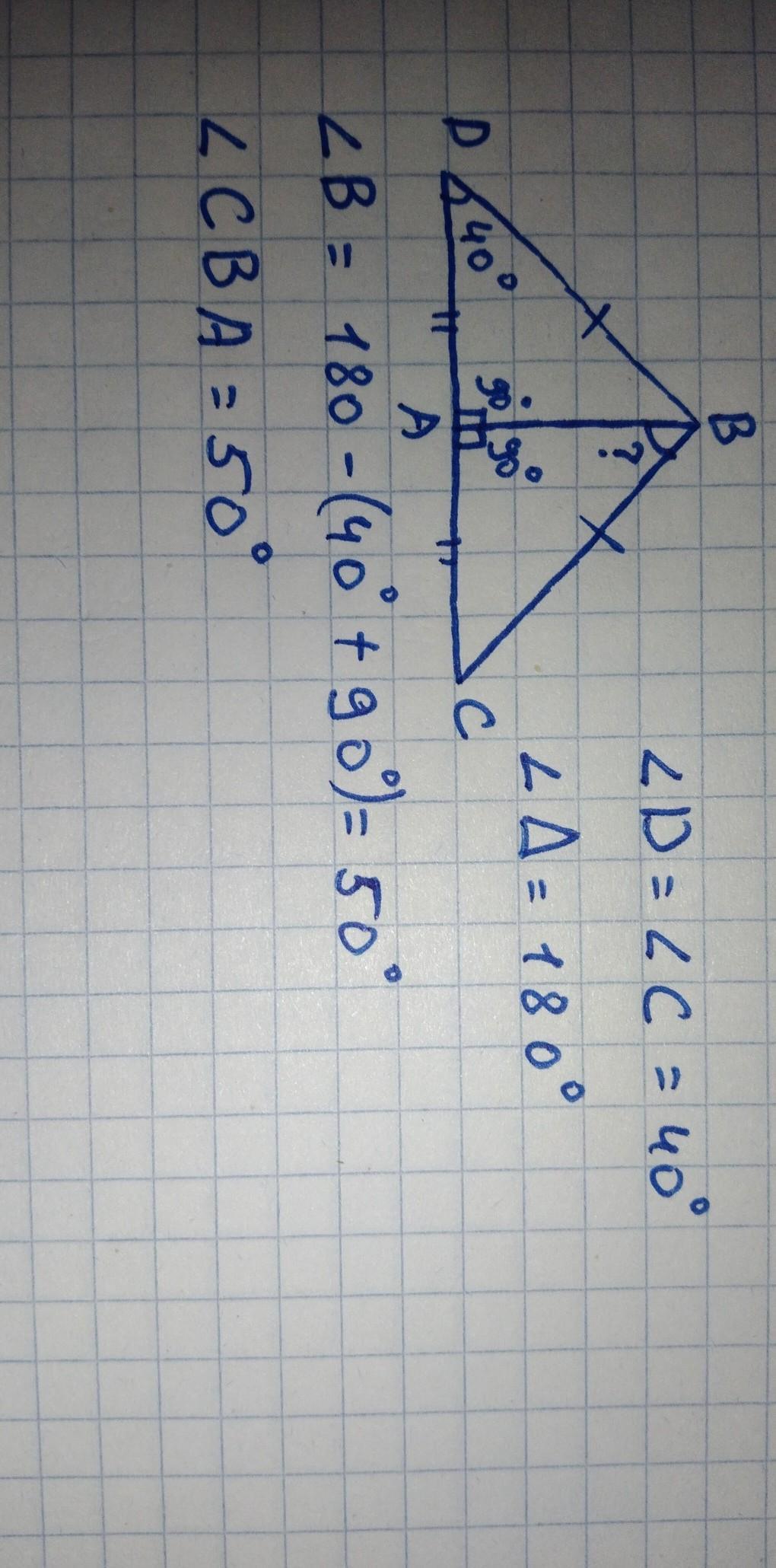 Дано : Равнобедренный треугольник DBC , из вершины В опушена высота (бессиктрисса и медиана) на точку А найдите угл CBA если угл ВDA равен 40° и две боковые строны равны