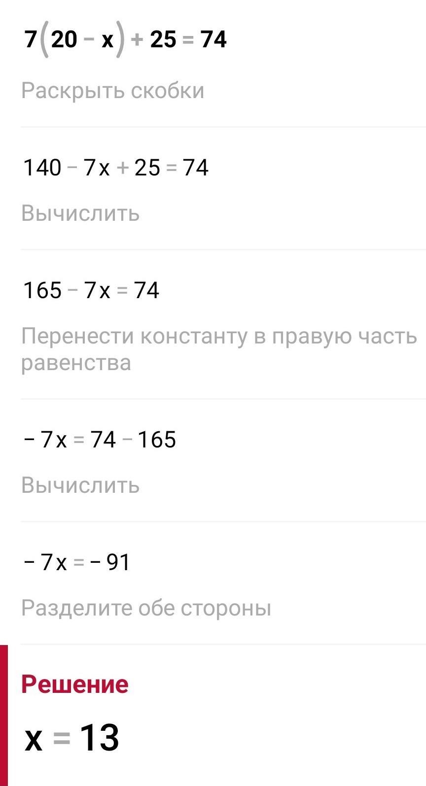 Для решения этого уравнения нужно отнять 25 от обеих сторон, разделить на 7, и перенести 20 на другую сторону: