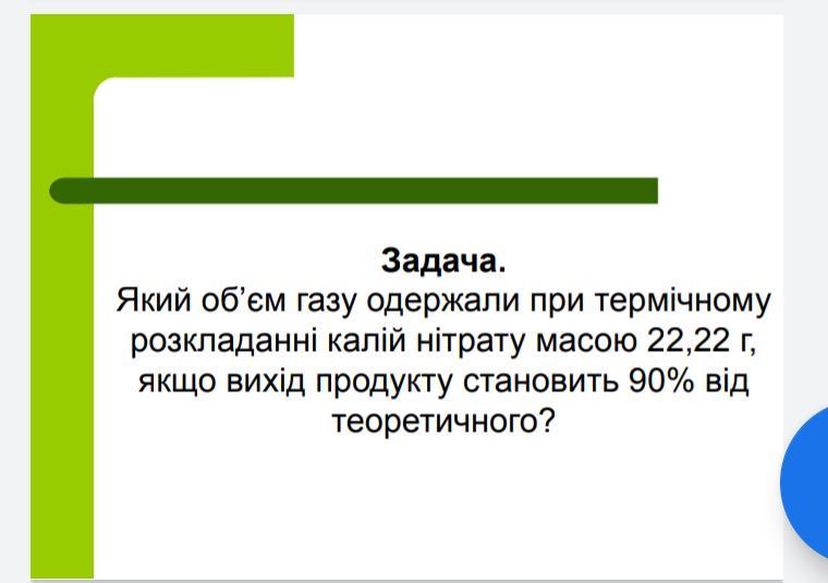 Вихід продукту становить 90% від теоретичного, що означає, що ми одержуємо 90% від об'єму газу, який би ми одержали при повному розкладанні калій нітрату.