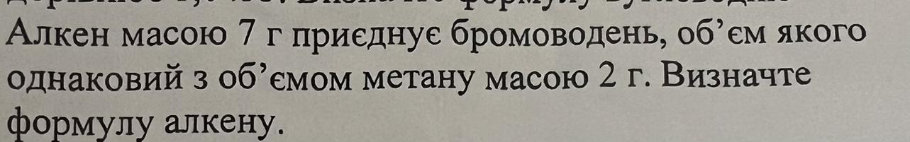 Алкен масою 7 г приєднує бромоводень, обʼєм якого однаковий з обʼємом метану масою 2 г. Визначте