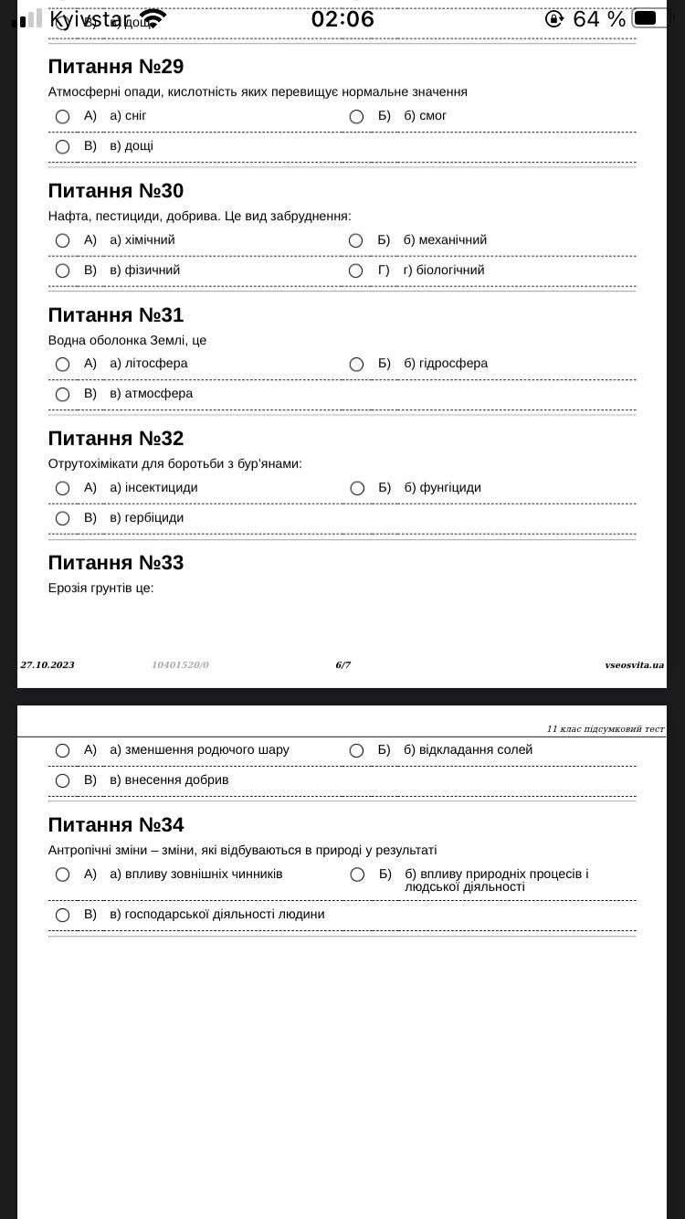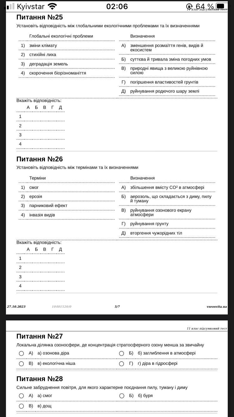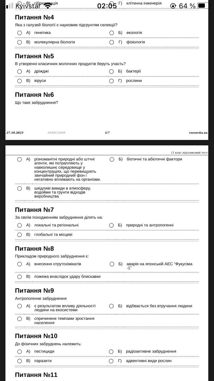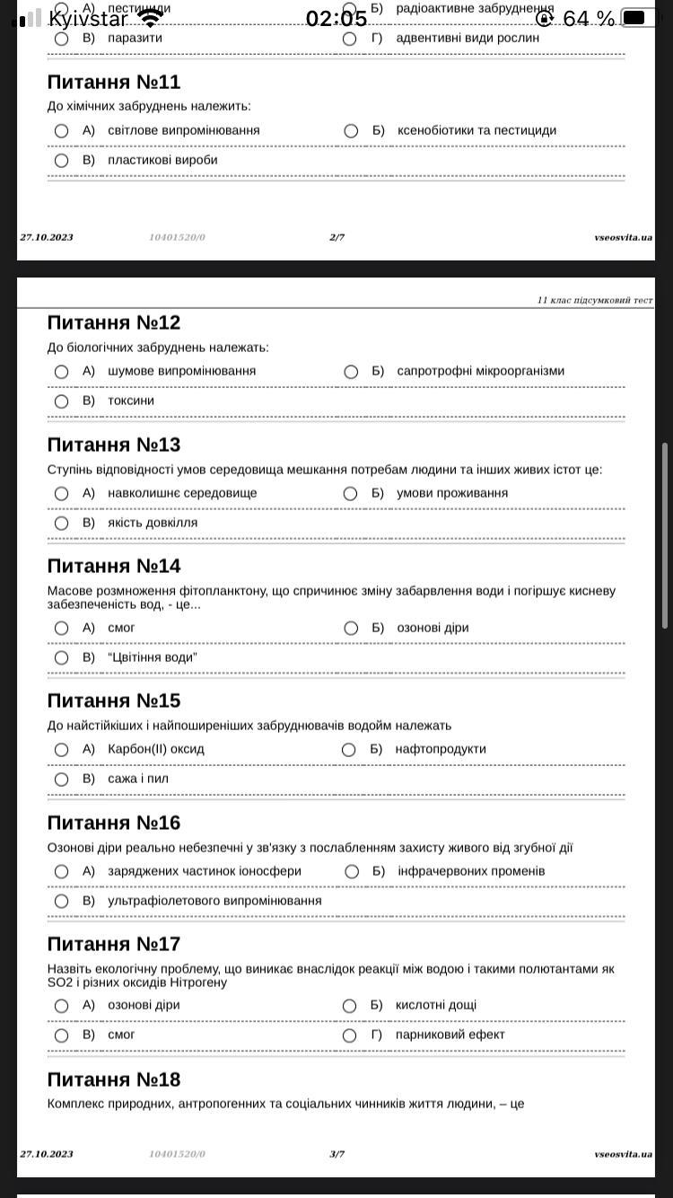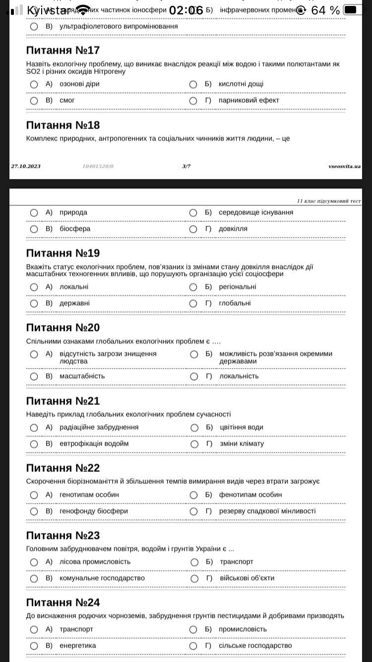 Відповідь: №4: В; №5 А; №6 Забруднення довкілля — процес зміни складу і властивостей однієї або декількох сфер Землі внаслідок діяльності людини. Приводить до погіршення якості атмосфери, гідросфери, літосфери та біосфери. Допустима міра забруднення довкілля в різних країнах регламентується відповідними стандартами, нормативами, законами. ; №7В; №8В; №9 незнаю, №10 А;№17; В