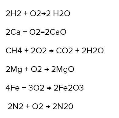 5.Напишите уравнения реакций горения веществ (7 баллов): I H2 + O2→ НО Ca + Oz)CaO CH4 + O2 → C+O + НО Mg + O2 → MgO +3 Fe + O2 → Fet o к + O2 → ко N2 + O2 → N+20 срочно пожалуйста