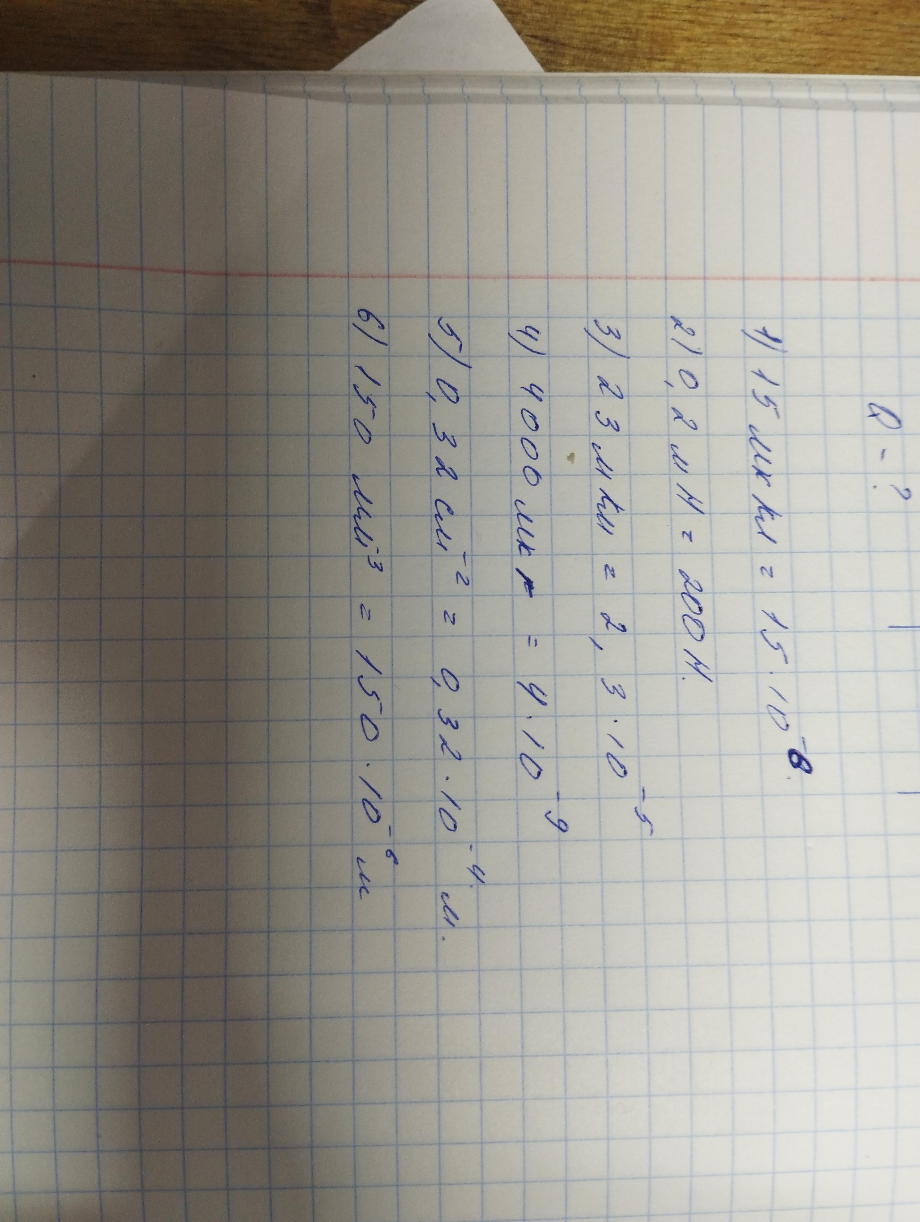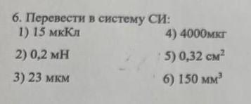 6. Перевести в систему СИ: 1) 15 мкКл 2) 0,2 мн 3) 23 мкм 4) 4000мкг 5) 0,32 см2 6) 150 мм3