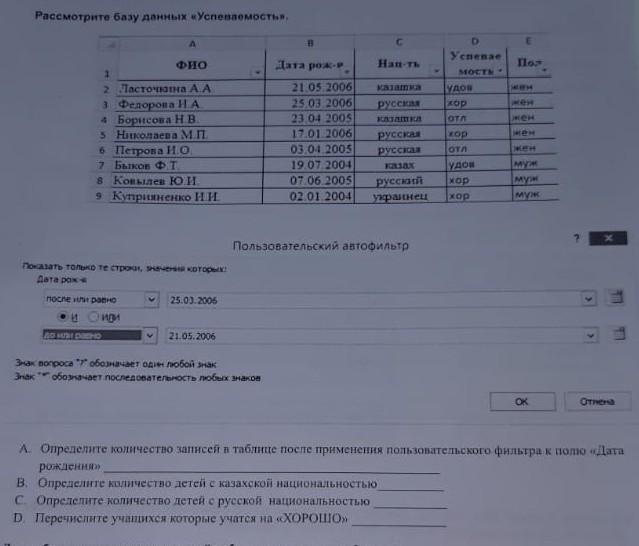 А. Определите количество записей в таблице после применения пользовательского фильтра к потю «Дата рождения»