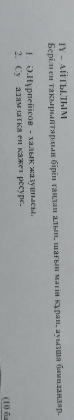 IY - АЙТЫЛЫМ Берілген тақырыптардын бiрiн тандап алып, шағын мәтін құрап, ауызша баяндандар. 1. Ә.Нұрпейісов - халык жазушысы. 2. Су - адамзатка ен кажет ресурс