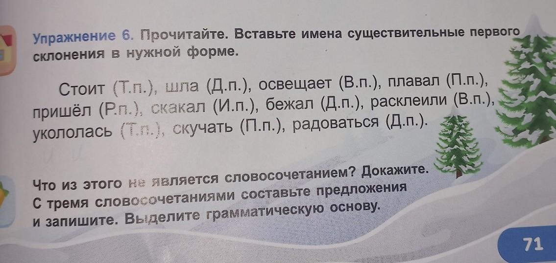 Упражнение 6. Прочитайте. Вставьте имена существительные первого склонения в нужной форме. Стоит (Т.п.), шла (Д.п.), освещает (В.п.), плавал (П.п.), пришёл (Р.п.), скакал (И.п.), бежал (Д.п.), расклеили (В.п.), укололась (Т.п.), скучать (П.п.), радоваться (Д.п.). Что из этого не является словосочетанием? Докажите. С тремя словосочетаниями составьте предложения и запишите. Выделите грамматическую основу.