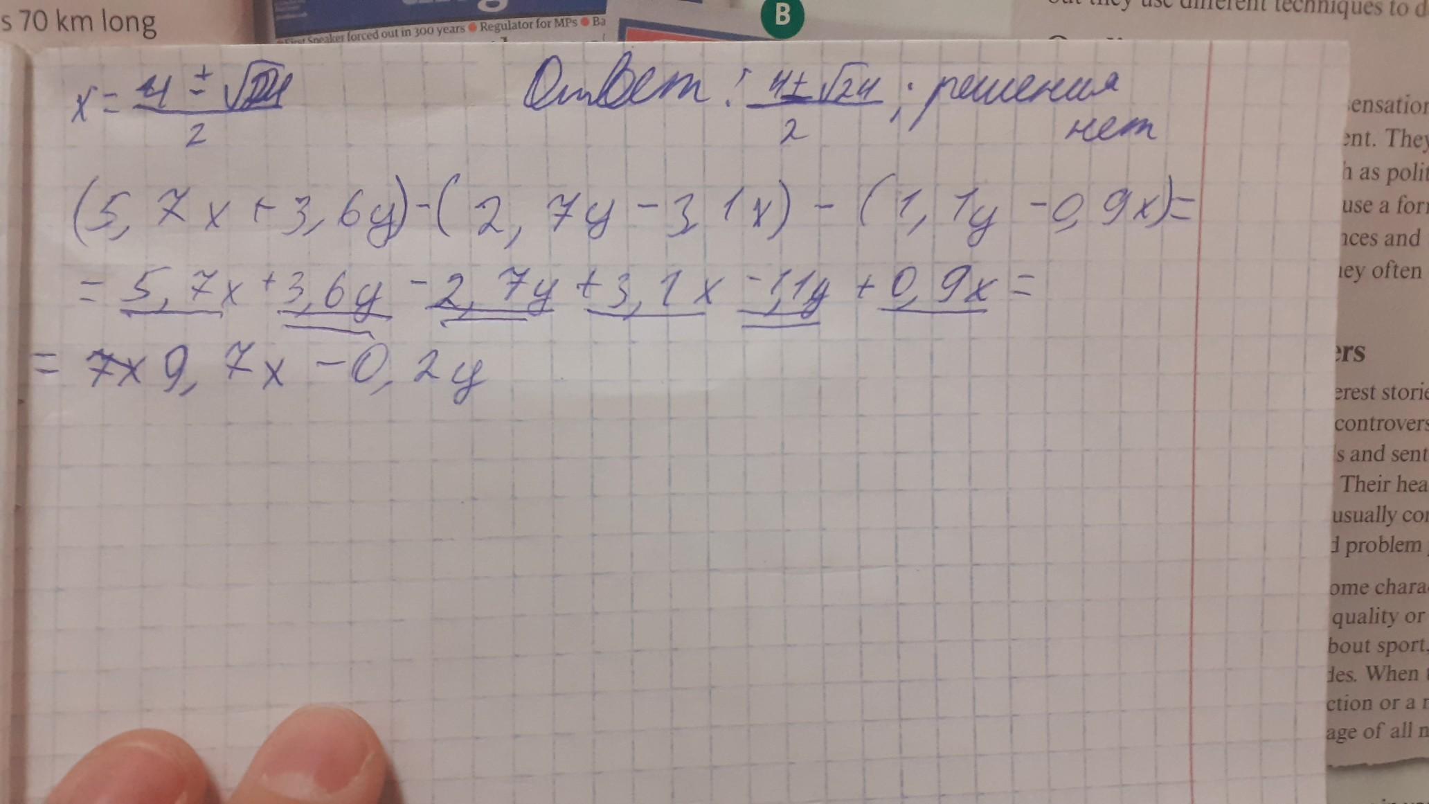 4. Раскройте скобки и приведите подобные слагаемые: (5,7х+3,6у)-(2,7y-3,1x)-(1,1y-0,9x)