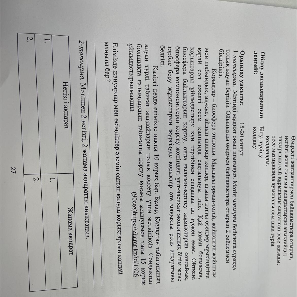 2 тапсырма: Негізгі ақпарат:1.Өорықтар биосфера эталоны. олар өсімдіктерді сақтайды.2.Аң құстардың үнісіз адамдар дұрыс өмір сүре алмайды