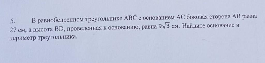 5. В равнобедренном треугольнике АВС с основанием АС боковая сторона АВ равна 27 см, а высота BD, проведенная к основанию, равна 9√3 см. Найдите основание и периметр треугольника. (с черчениям и полностью решать) Даю 30б.