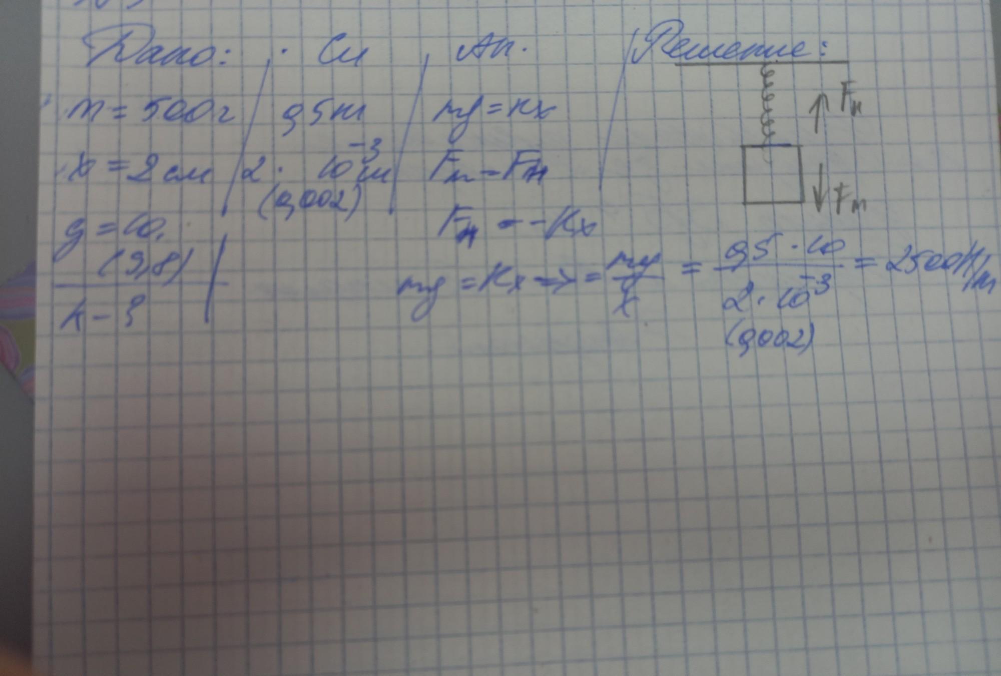 5. Пружина одним концом закреплена к неподвижной горизонтальной поверхности. Ко второму её концу прикрепили груз массой 500г, в результате чего пружина растянулась на 2см. a) Выполните схематический чертеж с указанием сил, действующих на пружину. b) Составьте векторное уравнение для сил этой системы. Какой закон был применен при составлении уравнения Определите коэффициент жесткости пружины.Народ срочно пожалуйста нужен ответ дам 90 баллов