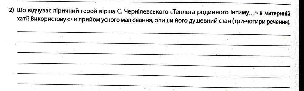 Що відчуває ліричний герой вірша С. Чернілевського «Теплота родинного інтиму...» в материній хаті? Використовуючи прийом усного малювання, опиши його душевний стан (три-чотири речення).