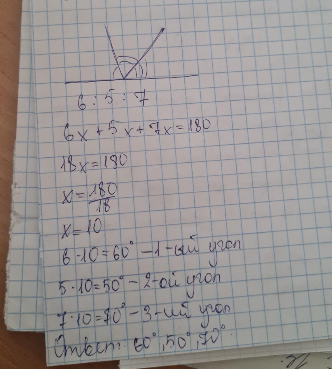 Розгорнутий кут розділили на три частини, градусні міри яких відносяться як 6:5:7. Знайдіть величину кожної