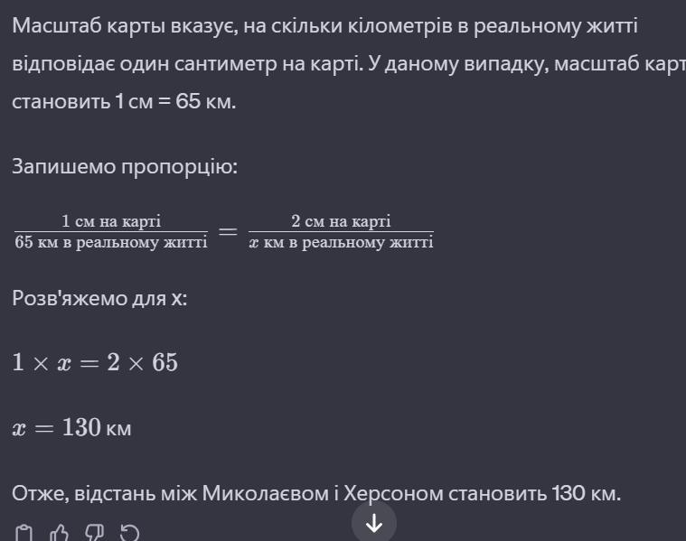Визначити відстань між Миколаєвом і Херсоном .Якщо відстань на карті 2 см а масштаб карты в 1 см 65 км