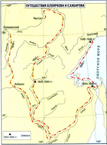 Пути экспедиций во вложениях.Как мы видим по карте они прошли через Охотское море(Тихий океан).Последняя карта-это путь Хабарова(где нарисован человек).