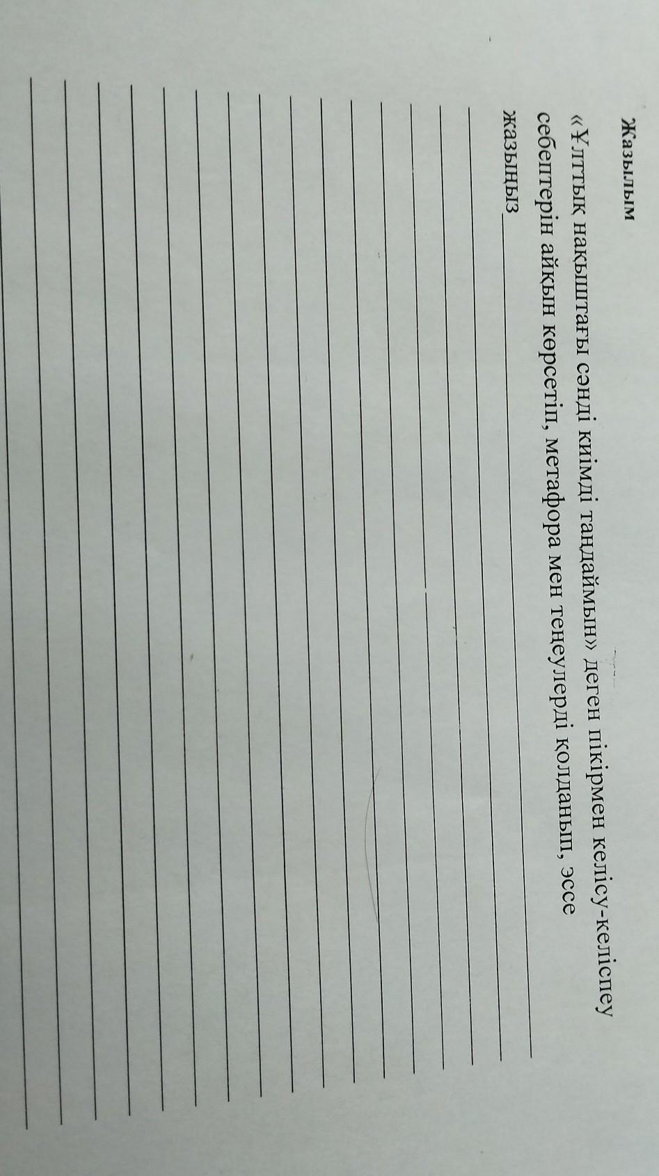 Жазылым «Ұлттык накыштагы сәндi киiмдi тандаймын» деген пiкiрмен келісу-келіспеу себептерін айкын көрсетіп, метафора мен теңеулердi колданып, эссе жазыныз