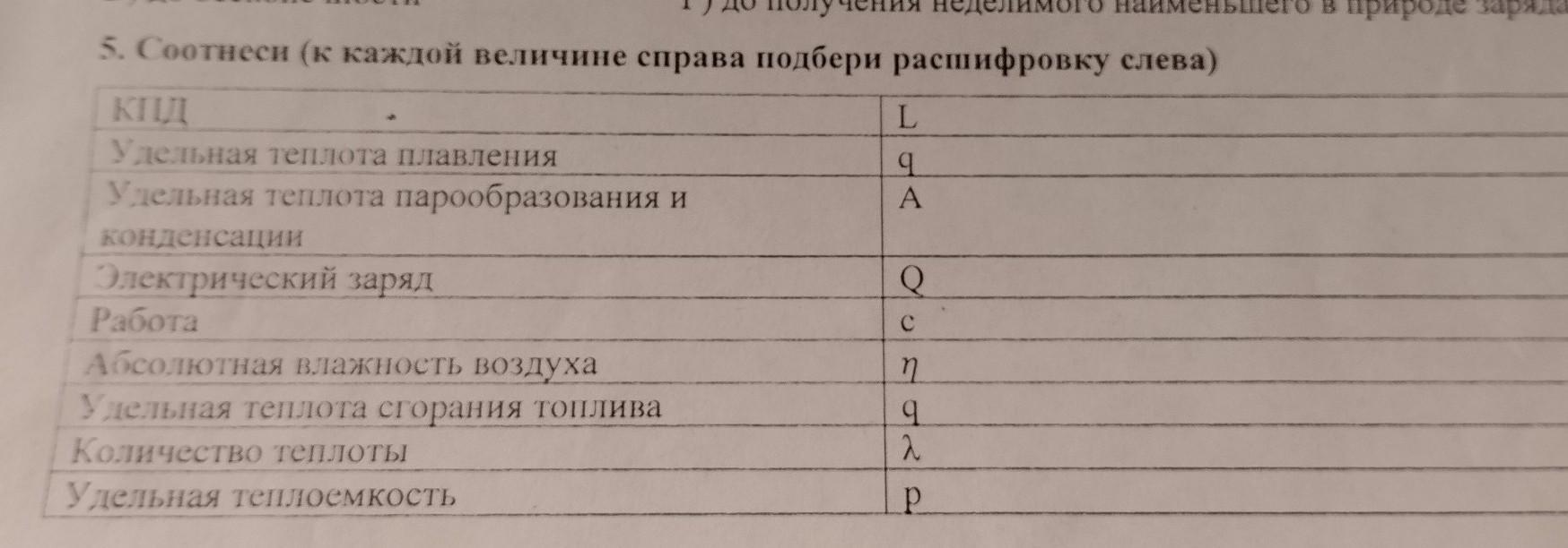 5. Соотнеси (к каждой величине справа подбери расшифровку слева) КПД Удельная теплота плавления Удельная теплота парообразования и конденсации Электрический заряд Paбота Абсолютная влажность воздуха Удельная теплота сгорания топлива КОЛИЧЕСТВО теплоты Удельная теплоемкость L 9 A Q с 9 2 P
